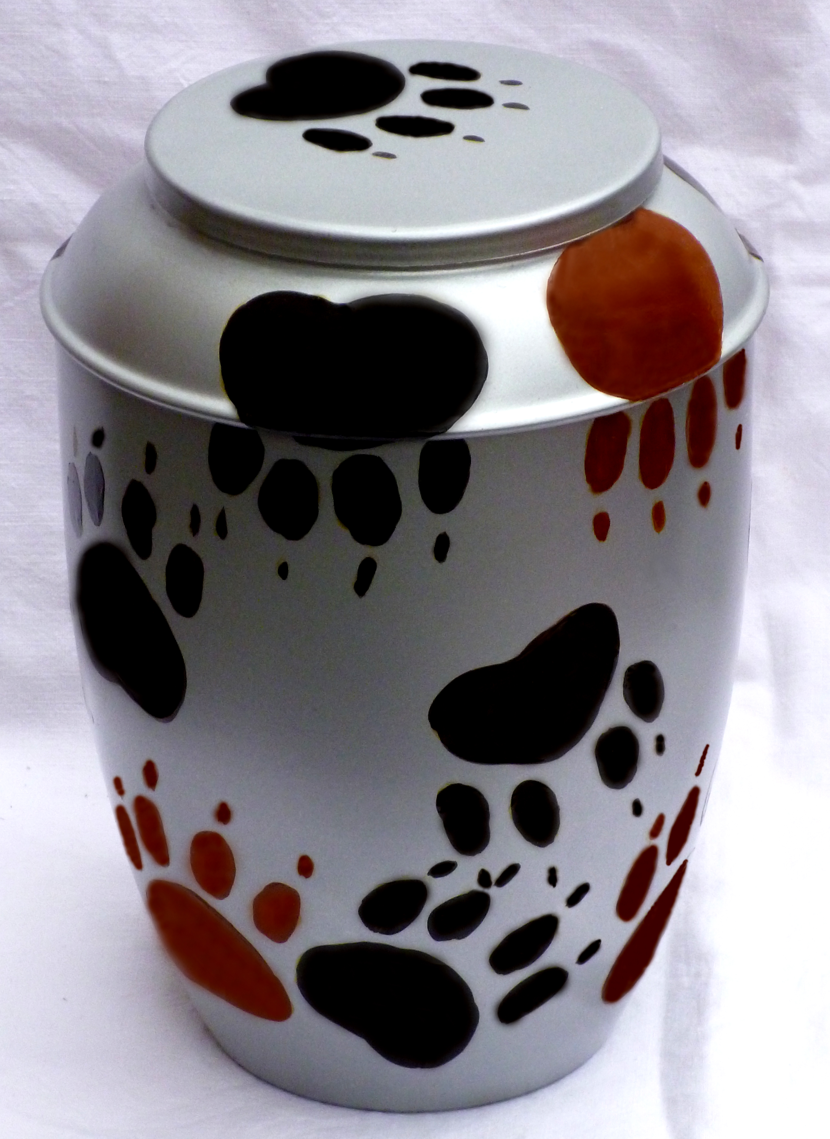 Farbe der Urne: Silber mit hellbraunen, braunen und schwarzen Hundetatzen